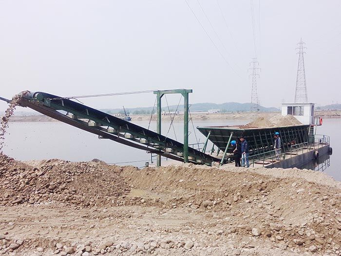 主要工作過程為:挖沙設(shè)備采集原料,輸送到運輸船儲料倉,然后經(jīng)過運輸船到岸邊,用輸送帶輸送到陸地上。