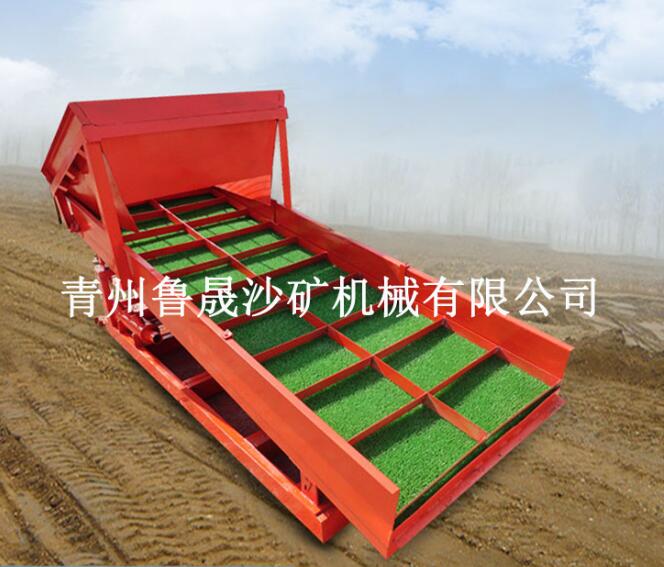 通過人工或者小型挖掘機(jī)將料上至料斗內(nèi),料斗內(nèi)有噴水裝置,料斗底板為傾斜式。礦料流淌流暢、均勻。礦料進(jìn)入精選槽格眼處和格邊處形成一個相對負(fù)壓的狀態(tài),對礦料有一個“吸”的作用,金被強(qiáng)制吸入,進(jìn)入相對平靜的格板下層內(nèi),經(jīng)過蠕動的作用格板內(nèi)的沙料是很疏松的,不會出現(xiàn)普通溜槽的板結(jié)現(xiàn)象。